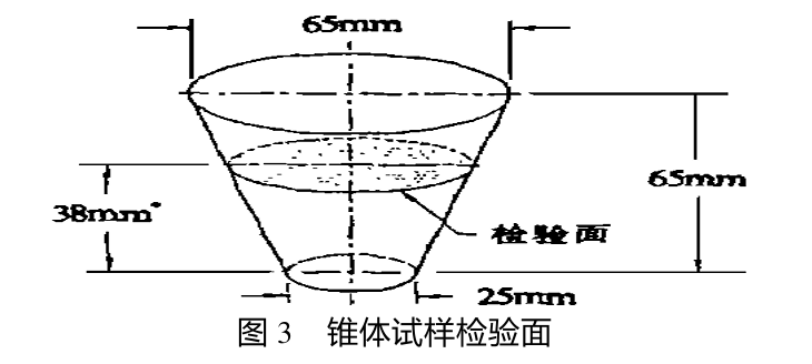 距底部38mm的橫截面為標(biāo)準(zhǔn)檢驗平面 ( 圖3) 。為此, 從距底部40mm 處與軸線呈正切方面切取試樣,在截體側(cè)面打上試樣號。