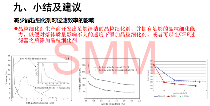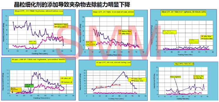 據(jù)丁總調(diào)查顯示,常用細(xì)化劑會(huì)對(duì)CFF過濾器的過濾性能產(chǎn)生負(fù)面影響,并隨較高的添加速率而惡化,并顯示晶粒細(xì)化劑種類對(duì)過濾性能影響不同。據(jù)業(yè)內(nèi)相關(guān)試驗(yàn)調(diào)查,鋁鈦碳或因無TiB2,從而減少對(duì)CFF過濾器的吸附、堵塞,會(huì)大大降低細(xì)化劑對(duì)過濾器性能的影響。