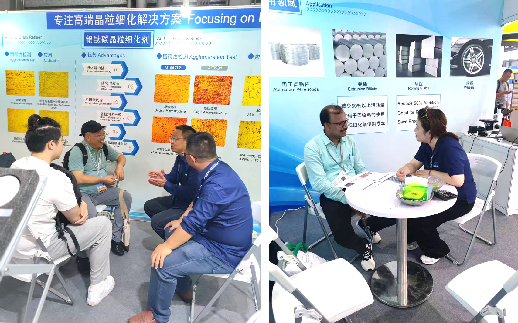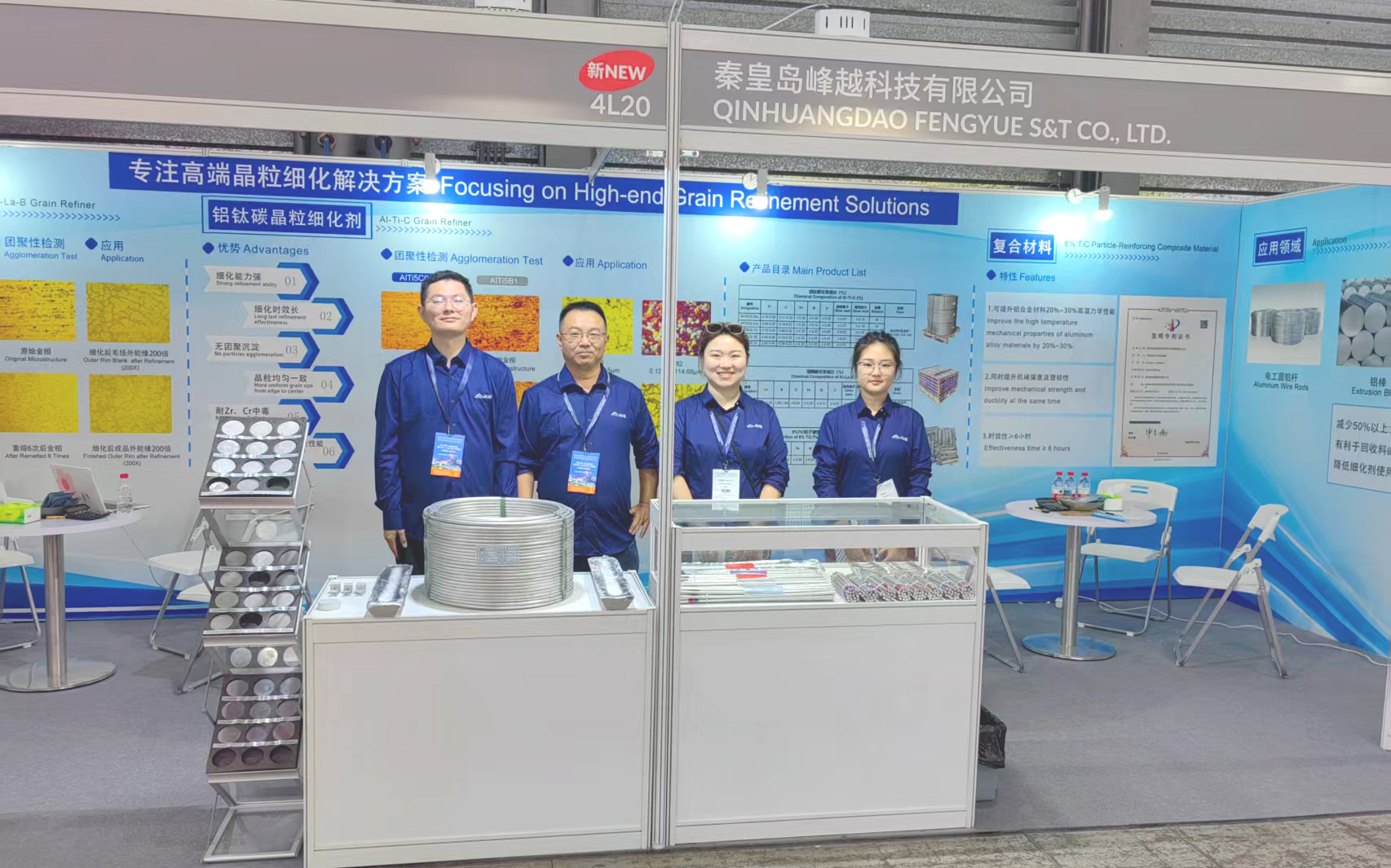 峰越科技此次重點展示了自主研發(fā)的鋁鑭硼(AlLa3B1.5)晶粒細化劑、6% TiC 顆粒增強復合材料和鋁鈦碳鈧(AlTi5C0.2Sc)晶粒細化劑。